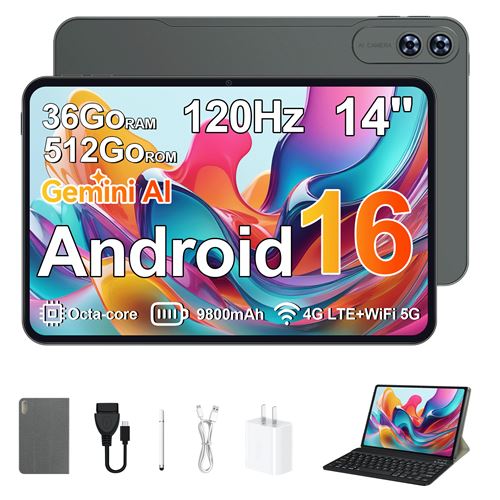 Tablette Tactile 14" Grande Taille FHD+ – 36Go RAM / 512Go Stockage – Android 16 – Batterie 9800mAh – Bluetooth 5.0 – WiFi 5G – Jack 3.5mm – Clavier + Housse de Protection