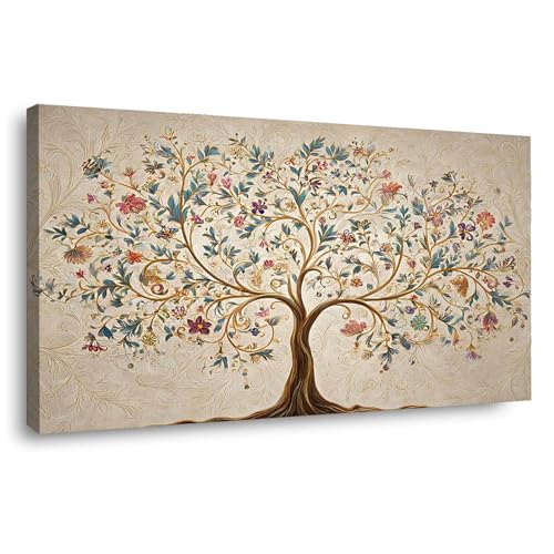 WIKEO Tableau moderne salon Fresque vintage de l’Arbre de Vie arbre de la vie abstrait tableaux- modernes XXL grande impression sur toile décoration murale chambre salon(Beige)-60x120cm Encadrée