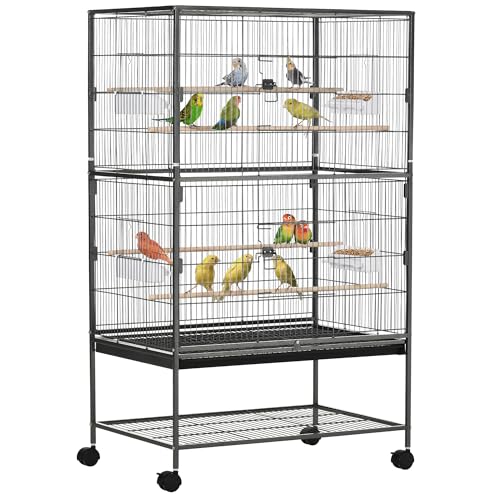 PawHut Grande Cage Oiseau sur Pied, Cage Perroquet sur roulettes avec 4 perchoirs, 4 mangeoires et Plateau Amovible, volière Oiseaux intérieur pour Perruche canari calopsitte, 78x52x132cm, Gris foncé