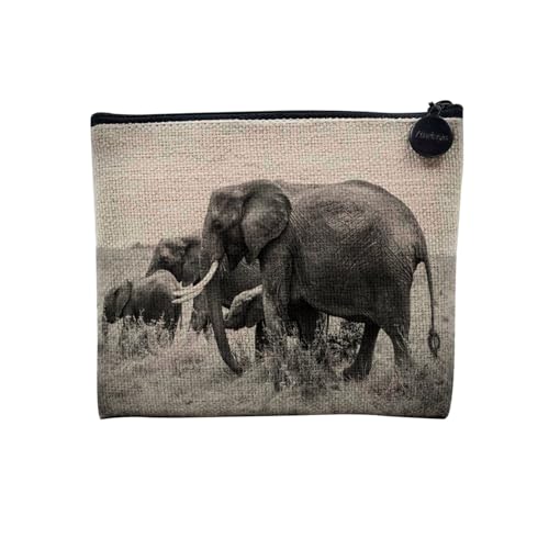 Pochette en Lin - Éléphant et Éléphanteau dans la Brousse Noir et Blanc - Trousse Maquillage en Toile Aspect Lin - Porte Monnaie - 15 x10 cm