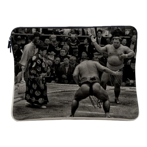 Housse Ordinateur et Tablette Aspect Lin - Combat de Sumo Japon Photo Noir et Blanc - 14-15 Pouces Pochette de Protection PC Portable Imprimé en France