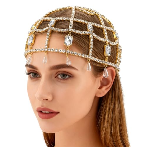 GORGECRAFT 1920s Coiffe en Cristal en Forme de Goutte avec Chaîne de Tête en Strass Golden Roaring 20s Great Gatsby pour Cheveux Chaîne de Cheveux Chapeau pour Mariée Cosplay Halloween Art Décor Fête