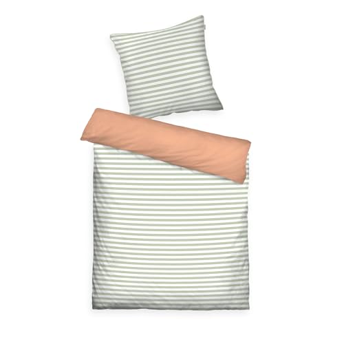 TOM TAILOR Linge de Lit, 80x80 + 155x220 cm, 100% Coton/Percale, Motif Réversible, Passepoil Coloré sur l'Oreiller et Fermeture Eclair, STRIPES WITH A KICK Vert Clair, Pêche (Green Leaf & Juicy Peach)