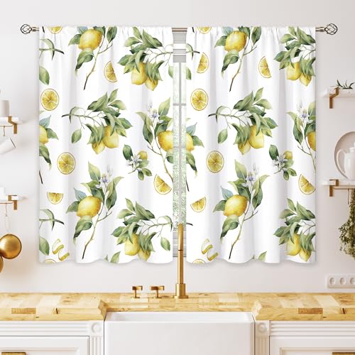 oolygoo Lemon Fruit Small Kitchen Curtains Green Yellow Leaf Summer Window Treatment Tropical Cafe Short Window Curtains for Bathroom Dining Laundry Room Floral Flower Treatment Drapes 27.5x39 inch