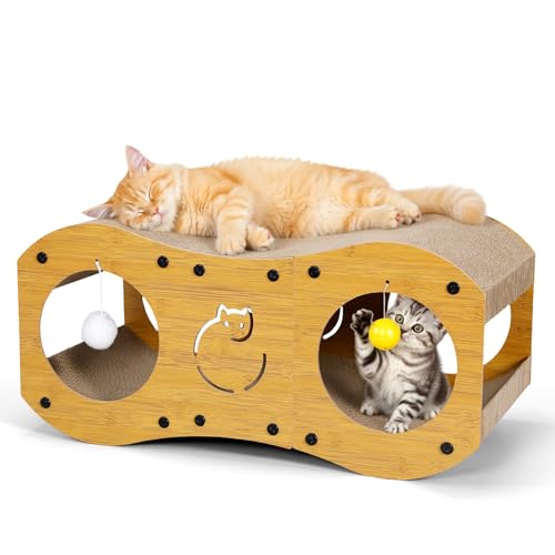 Gimars Griffoir Chat en Carton 3-en-1 avec Tunnel, Griffoir en Carton pour Chats avec Balles, Protection des Meubles, Style Bois, Naturel