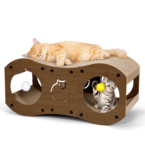 Gimars Griffoir Chat en Carton 3-en-1 avec Tunnel, Griffoir en Carton pour Chats avec Balles, Protection des Meubles, Style Bois (Noyer)
