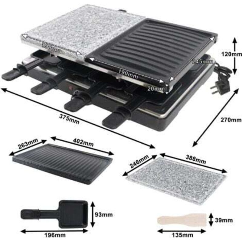 Naizy – Grill raclette électrique 1400W pour 8 personnes – Acier inoxydable 304 – Dalle de granit et plaques antiadhésives – Intérieur/extérieur