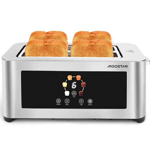 Aigostar Grille-Pain 4 Tranches, Écran Tactile LED, Grille Pain à Fentes Longues, Fente Extra Large de 4 cm & Auto-Centrage, 6 Niveaux de Dorage, Réchauffage, Décongélation & Annulation, 1400W