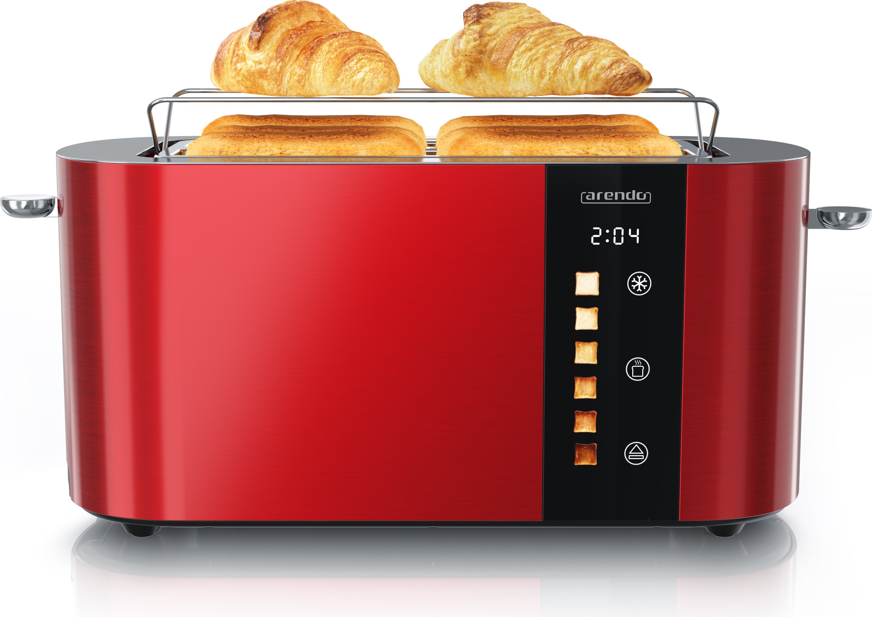 Grille-pain Arendo 4 tranches, fente longue, fente longue, acier inoxydable, 1500W, écran avec indication du temps restant, support à petits pains, fonction dégivrage, boîtier thermo-isolant, écran tactile, rouge