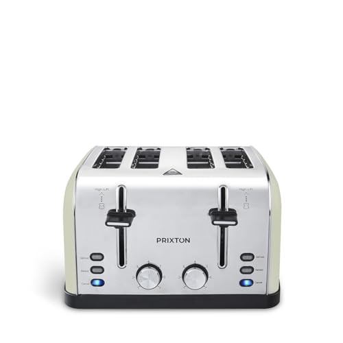 PRIXTON Grille-pain à 4 fentes extra-larges Bianca, Puissance 1900 Watt, 7 Niveaux de brunissage, décongélation et réchauffe, Surélévation, Design Vintage en Acier Inoxydable