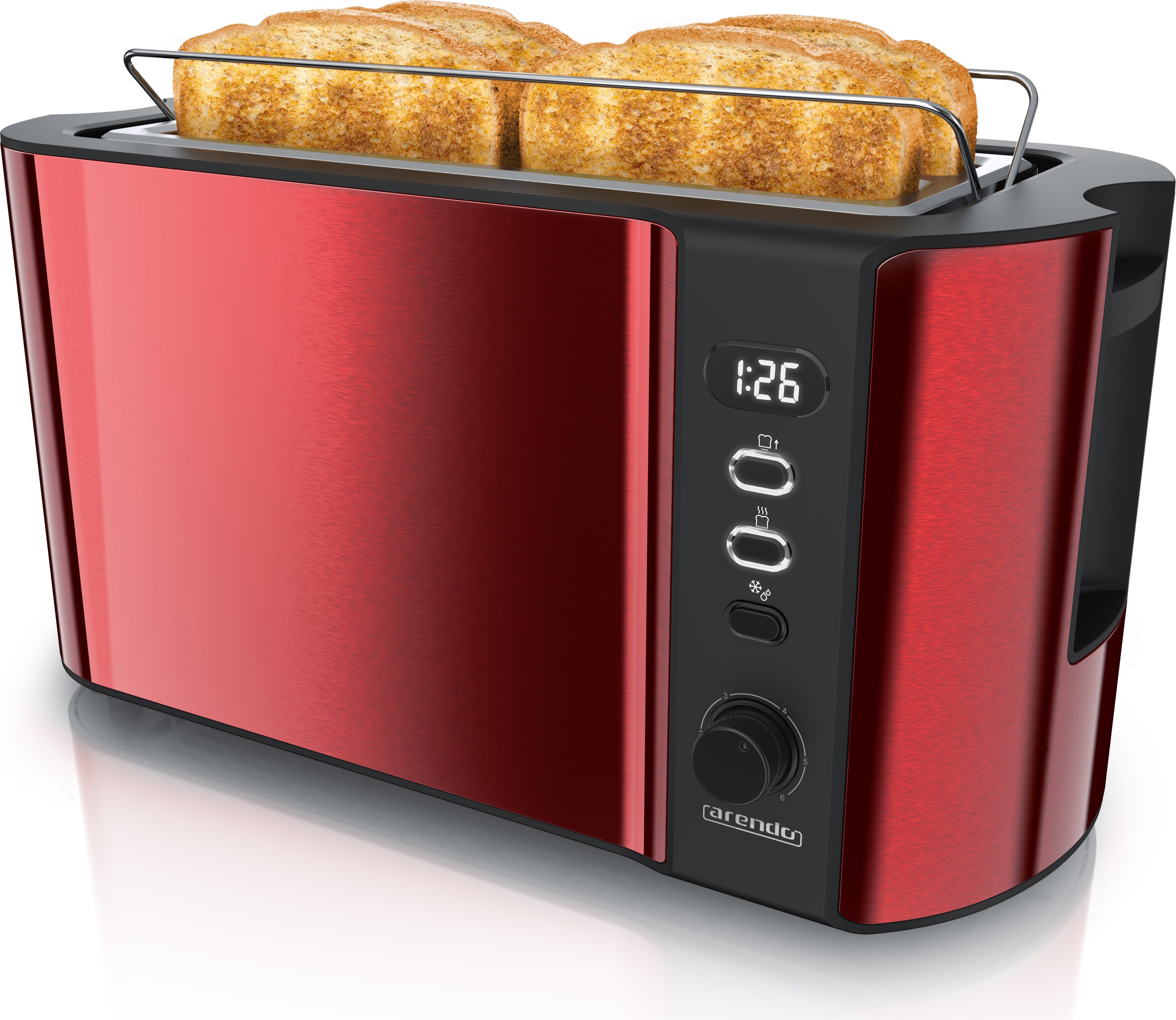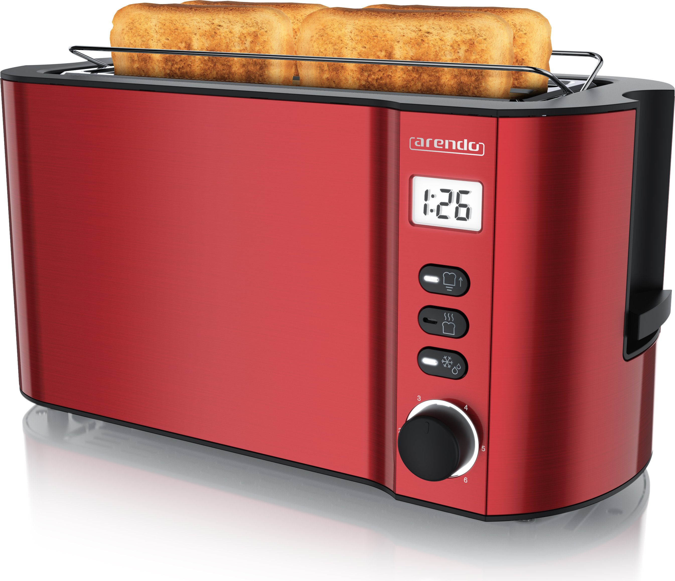 Grille-pain Arendo 4 tranches, fente longue, acier inoxydable, 1500W, écran avec affichage du temps restant, support à petits pains, fonction décongélation, boîtier thermo-isolant, rouge