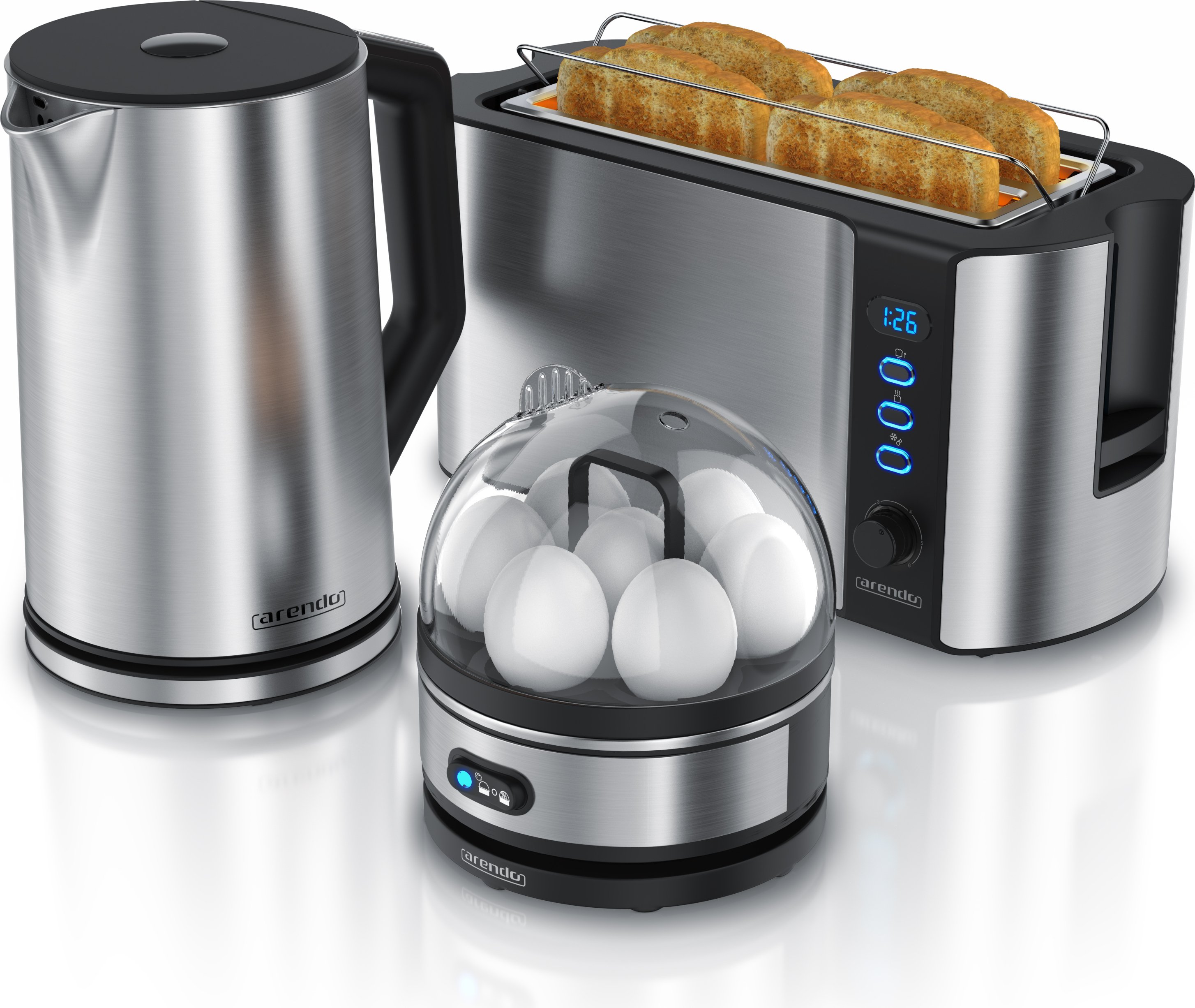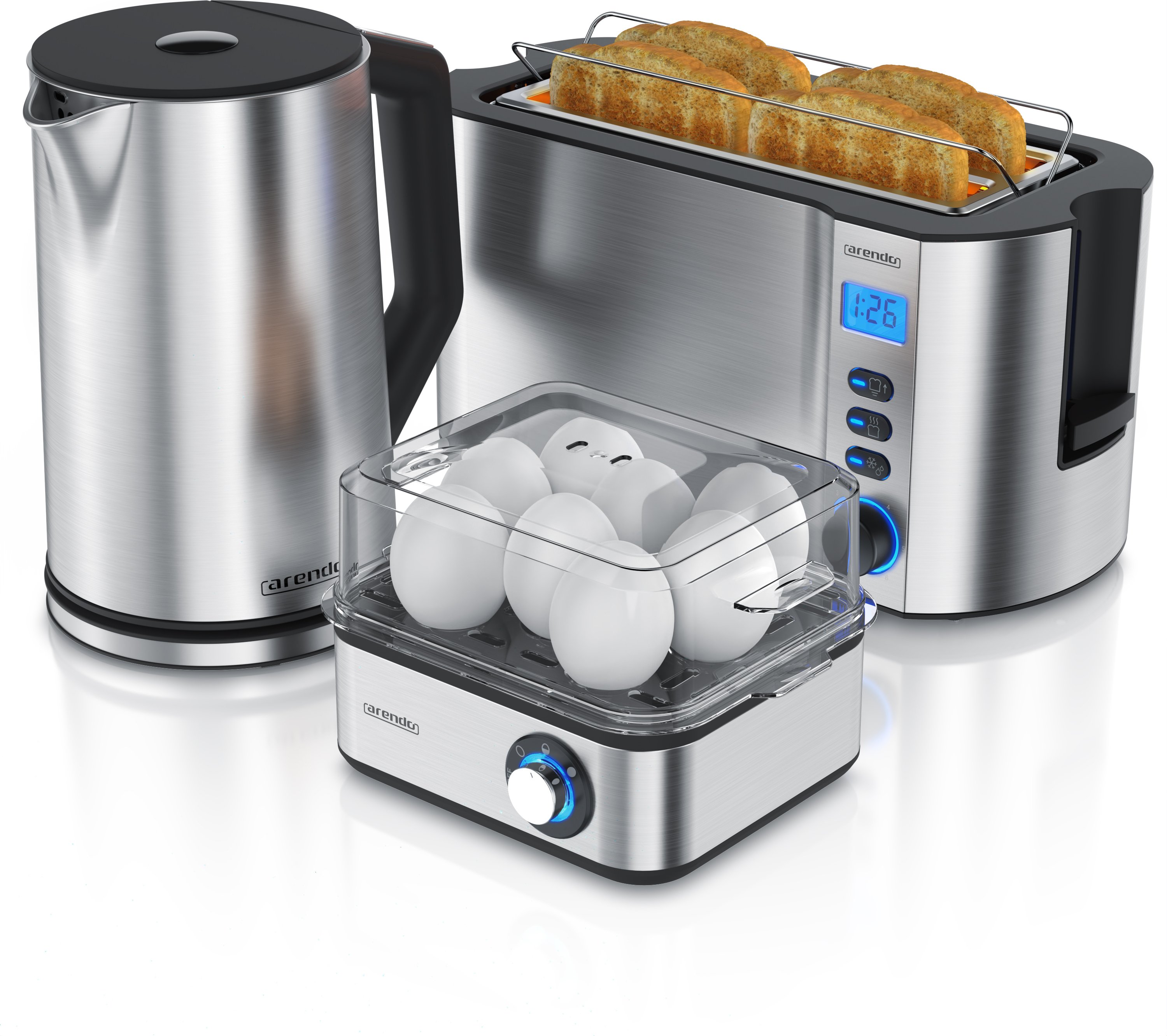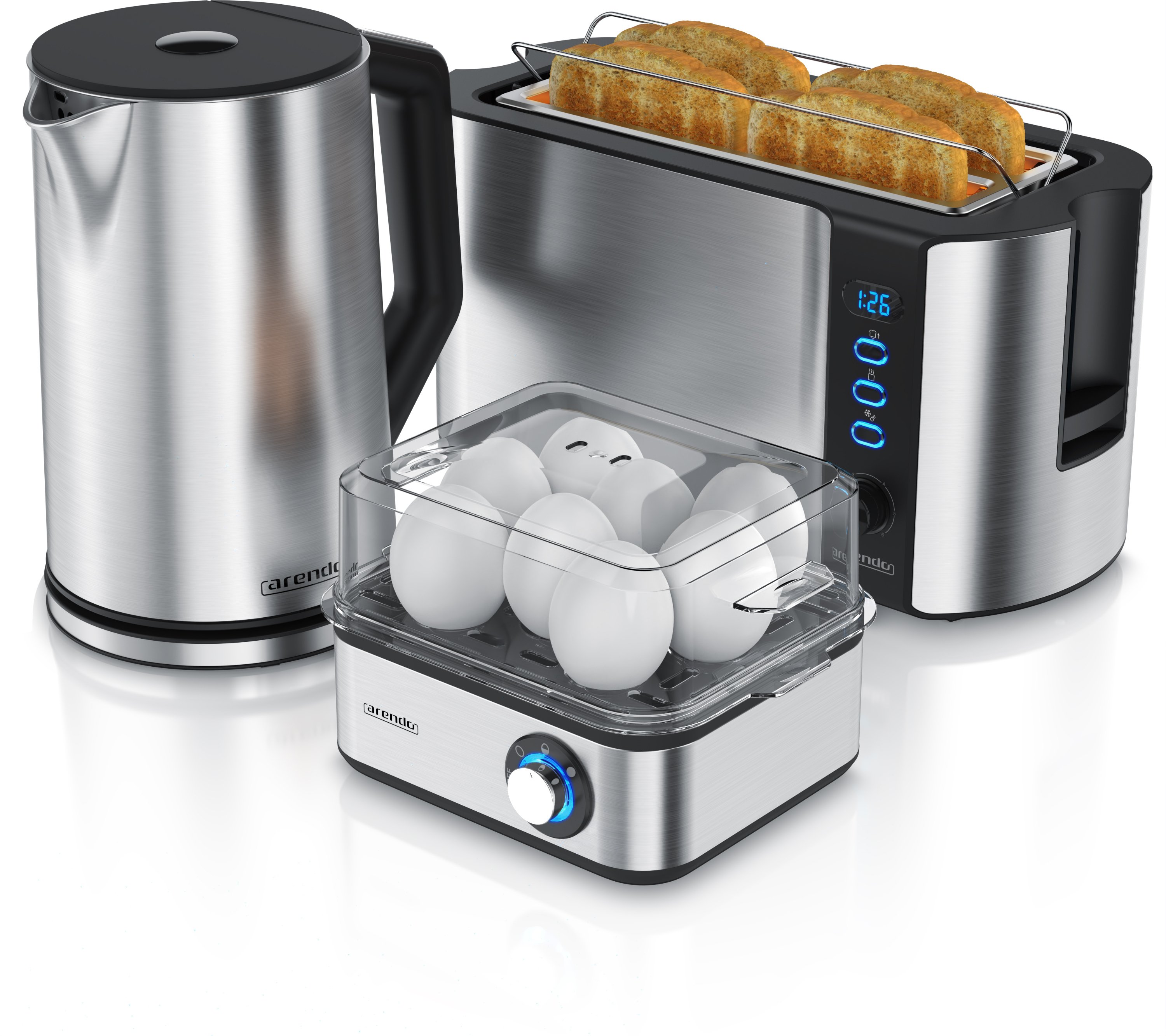 Arendo Breakfast set 3 pièces, bouilloire 1,5l, grille-pain 4 tranches à fente longue, cuiseur à ufs 7, argent
