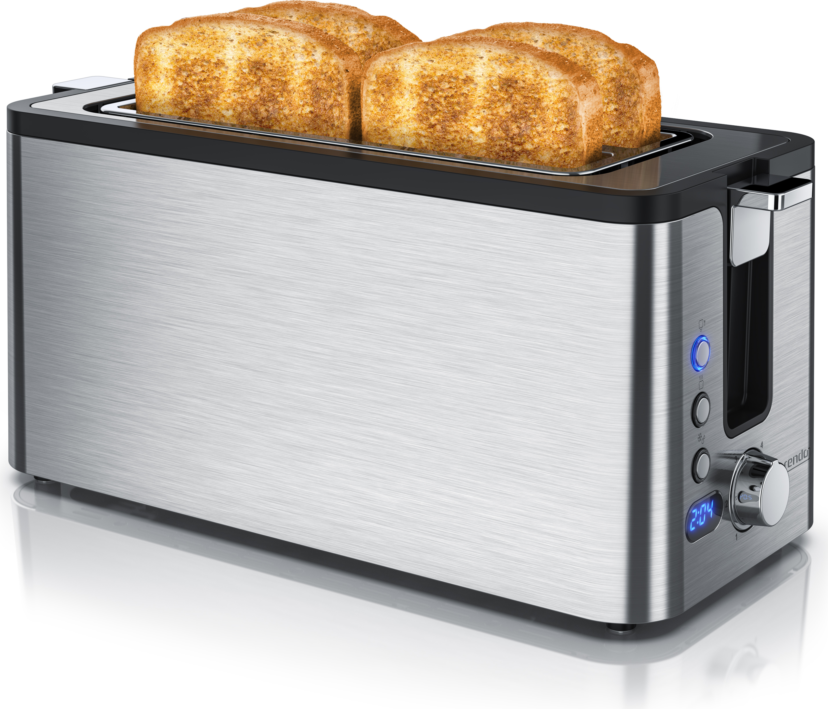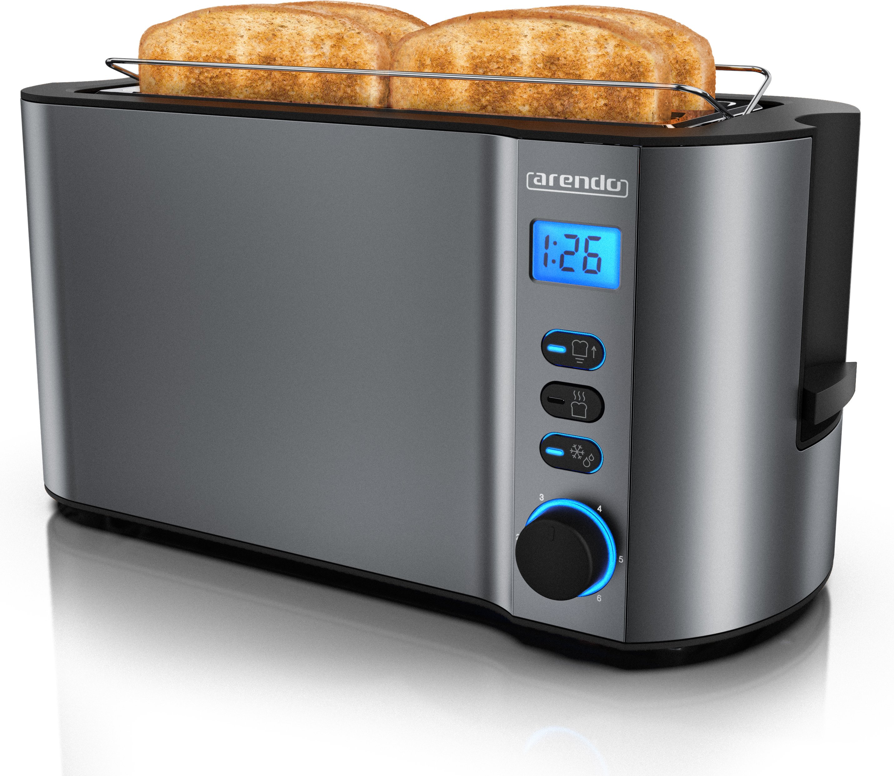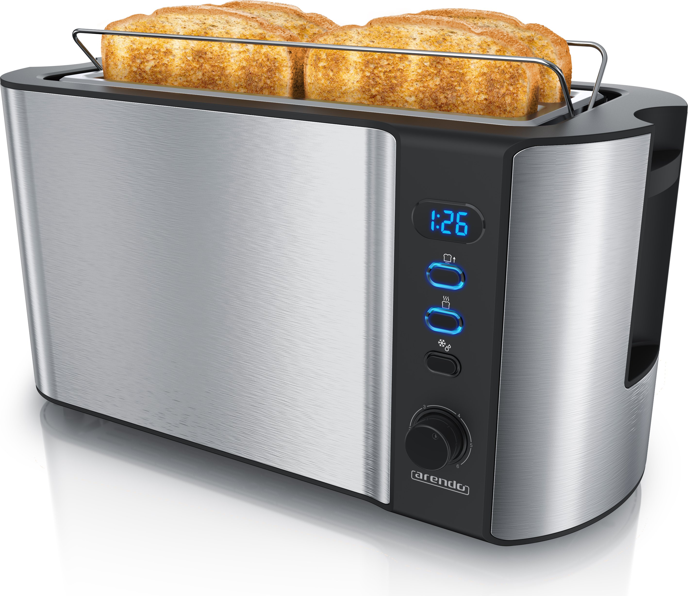Arendo Grille-pain 4 tranches, Grille-pain à fentes longues, Fente longue, Acier inoxydable, 1500W, Écran avec affichage du temps restant, Support à petits pains, Fonction dégivrage, Boîtier thermo-isolant, Argent