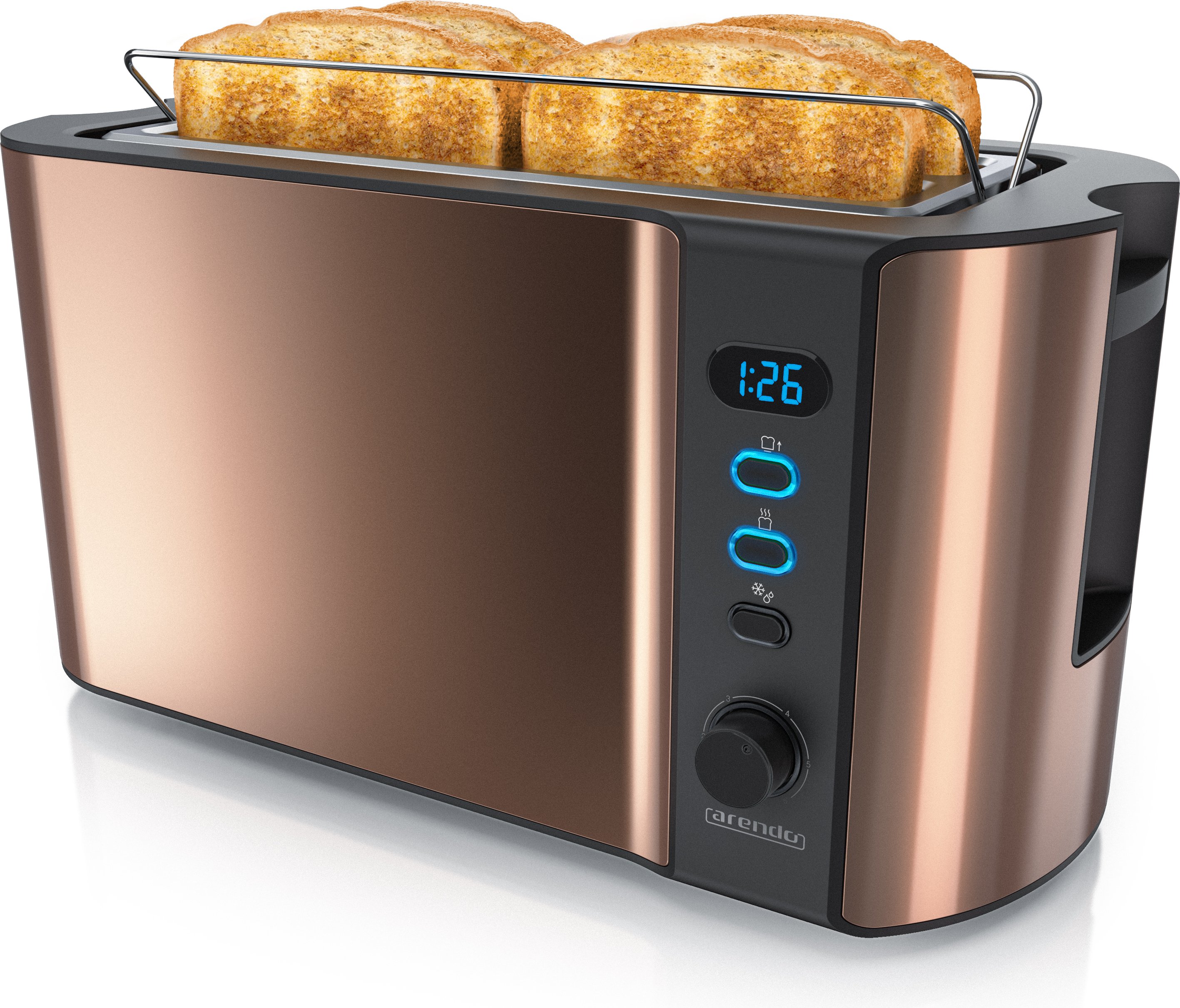 Grille-pain Arendo 4 tranches, fente longue, acier inoxydable, 1500W,tactile, écran avec indication du temps restant, support à petits pains, fonction décongélation, boîtier thermo-isolant, cuivre