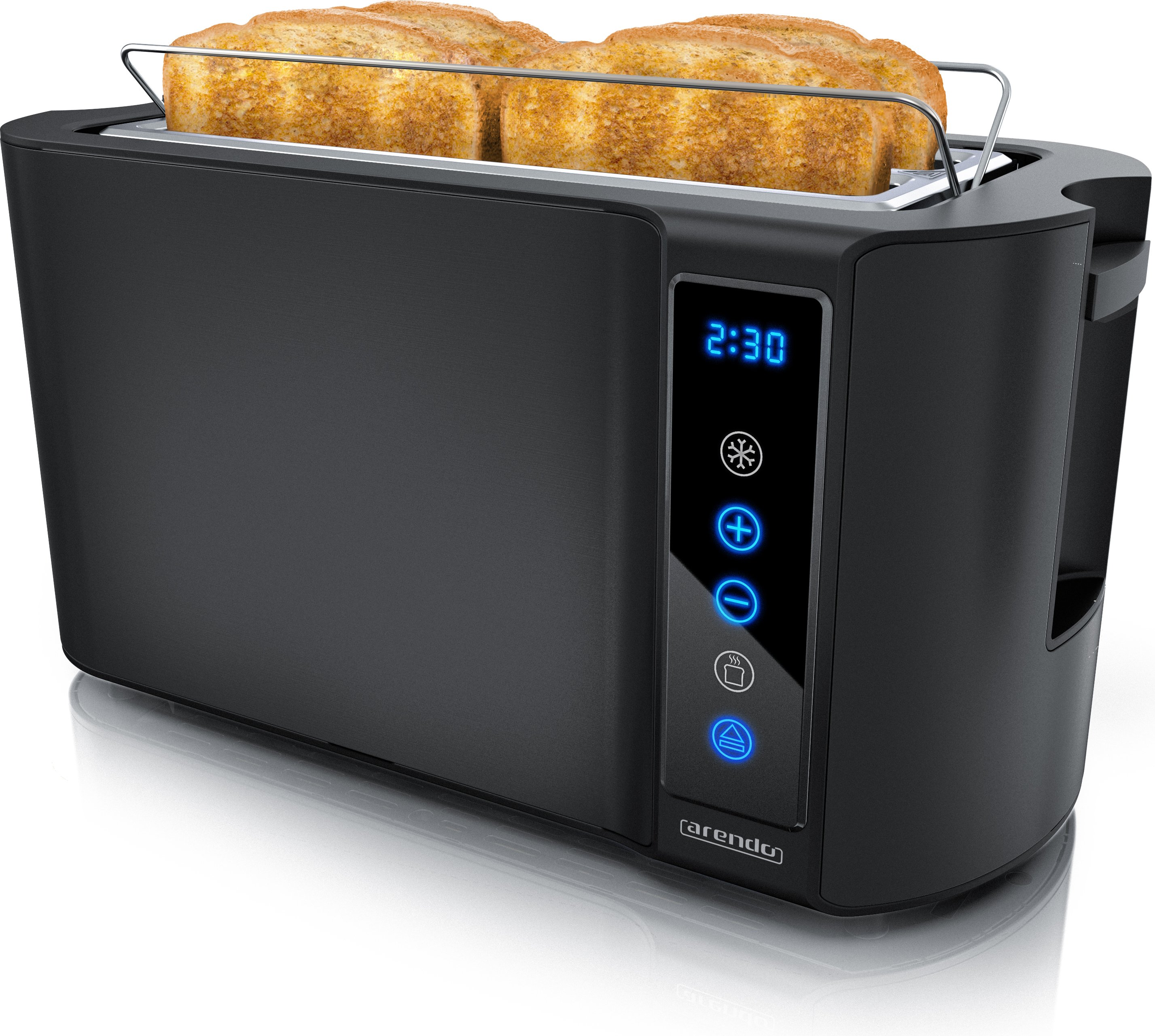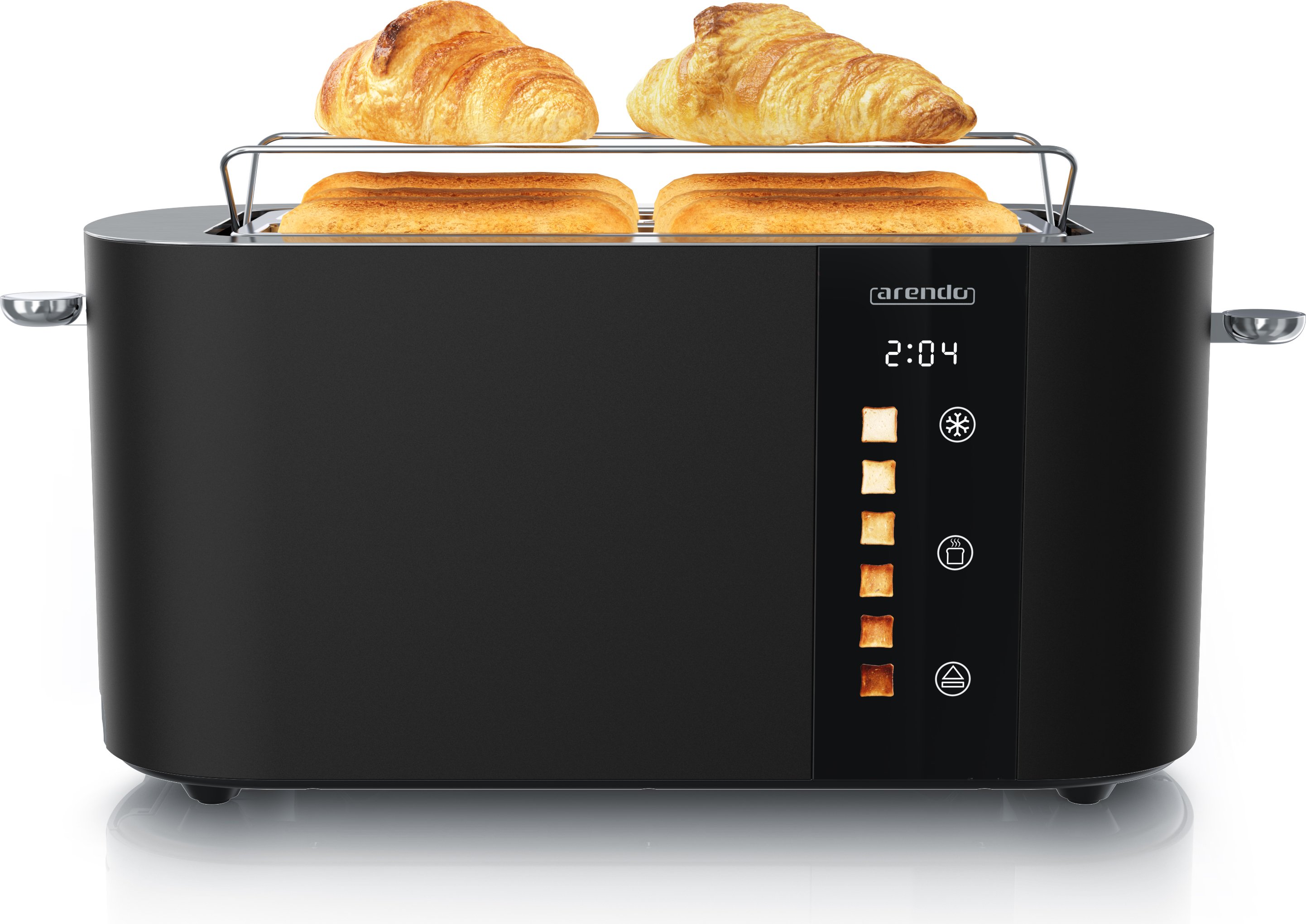 Grille-pain Arendo 4 tranches, fente longue, acier inoxydable, 1500W, tactile, écran avec affichage du temps restant, support à petits pains, fonction décongélation, boîtier thermo-isolant, noir-brillant