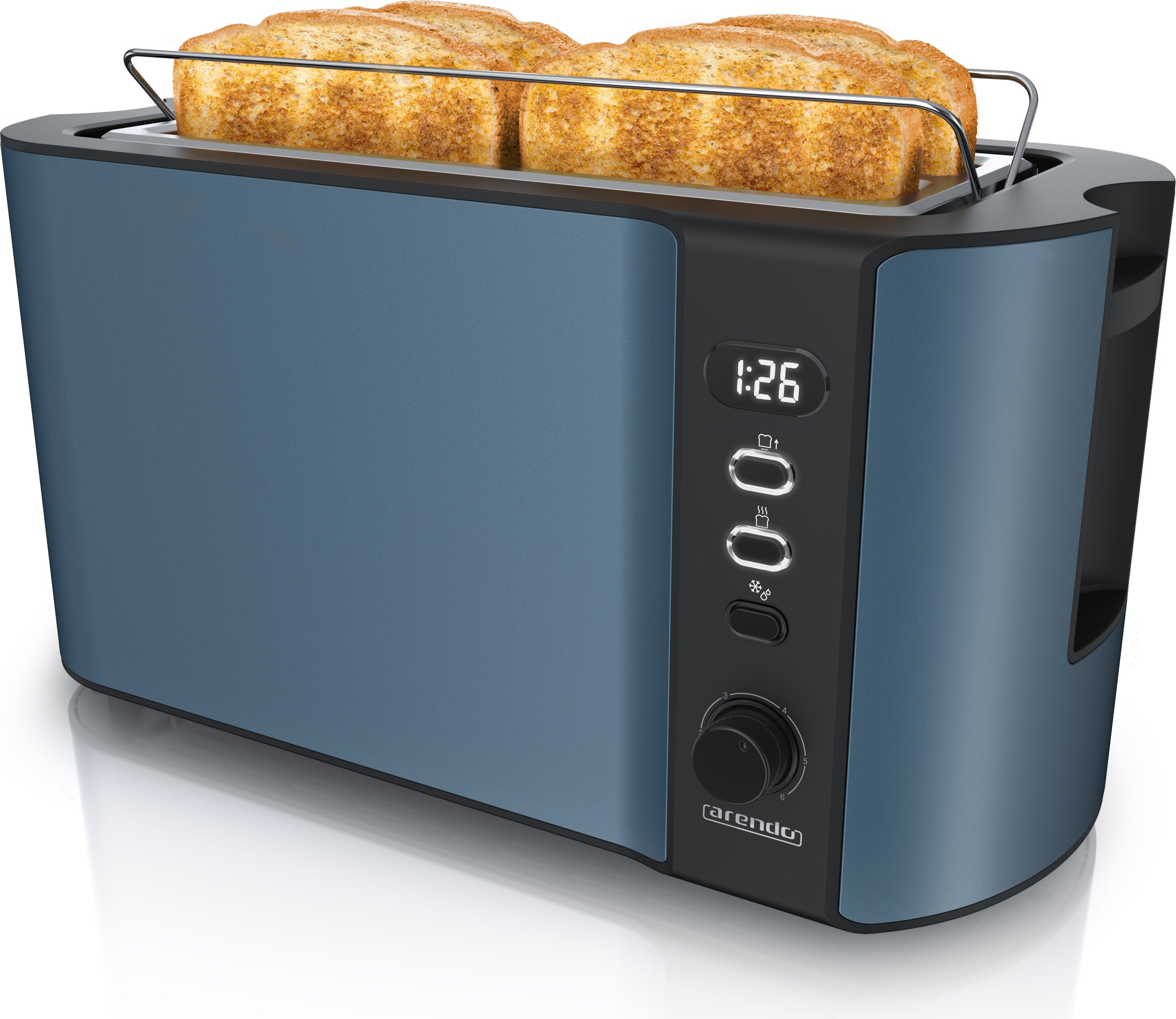 Arendo Grille-pain 4 tranches, Fente longue, Fente longue, Acier inoxydable, 1500W, Écran avec affichage du temps restant, Support à petits pains, Fonction dégivrage, Boîtier thermo-isolant, Bleu