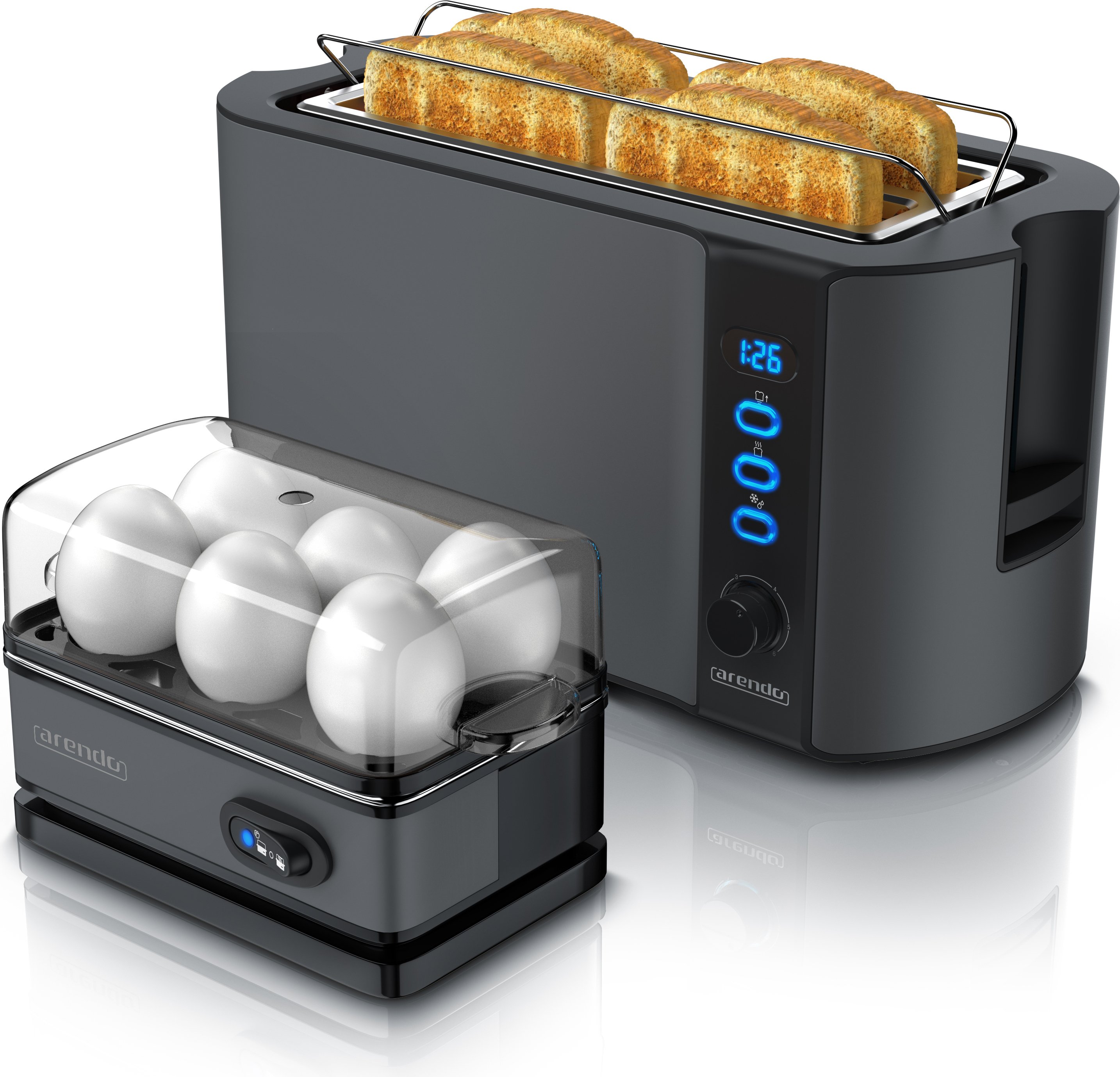 Arendo set petit-déjeuner 2 pièces - grille-pain 4 tranches à fente longue, cuiseur à ufs 6 pièces, gris