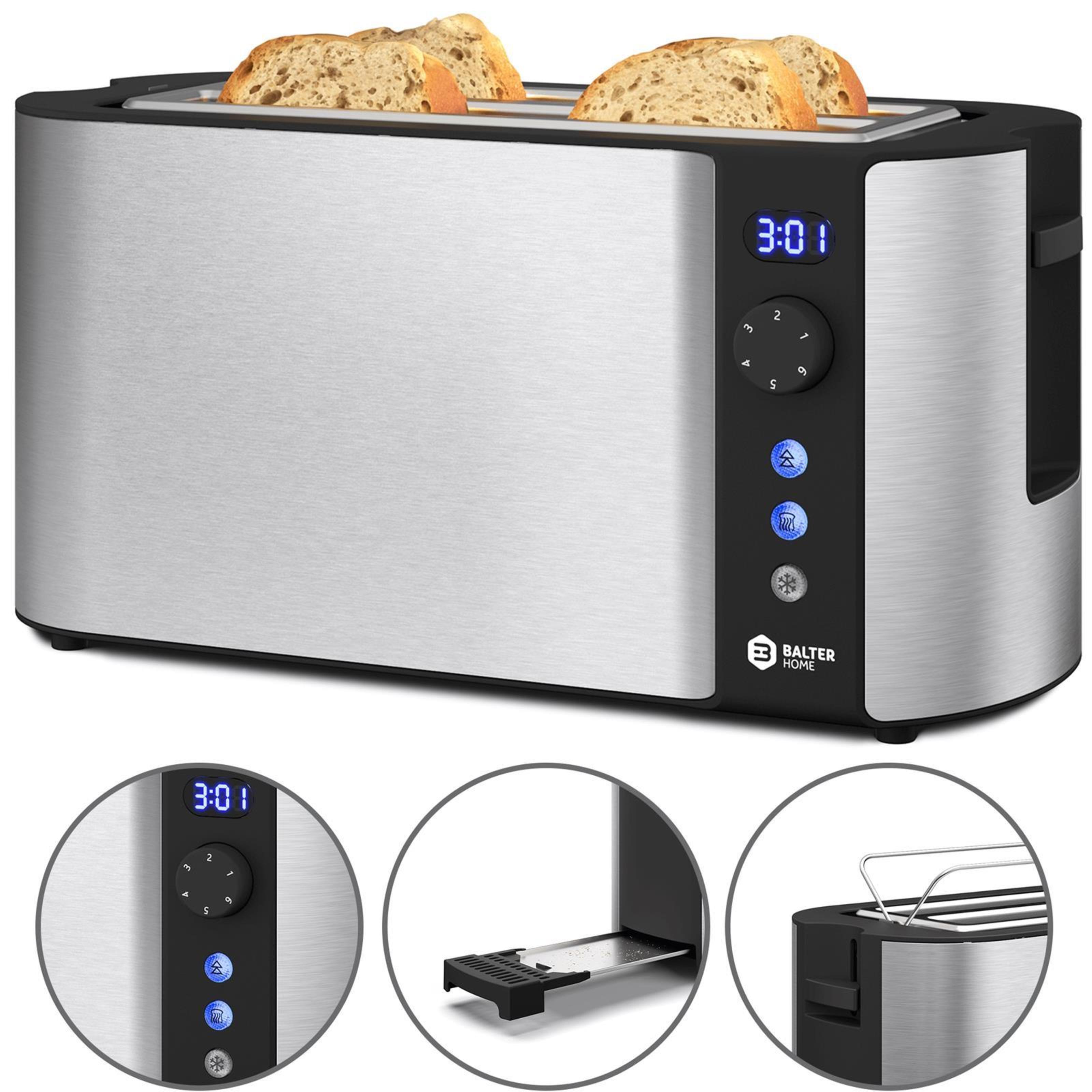 Grille-pain Balter 4 tranches à fente longue, 1500W, écran, affichage du temps restant Boîtier à double paroi, support à petits pains, fonction de décongélation, argenté