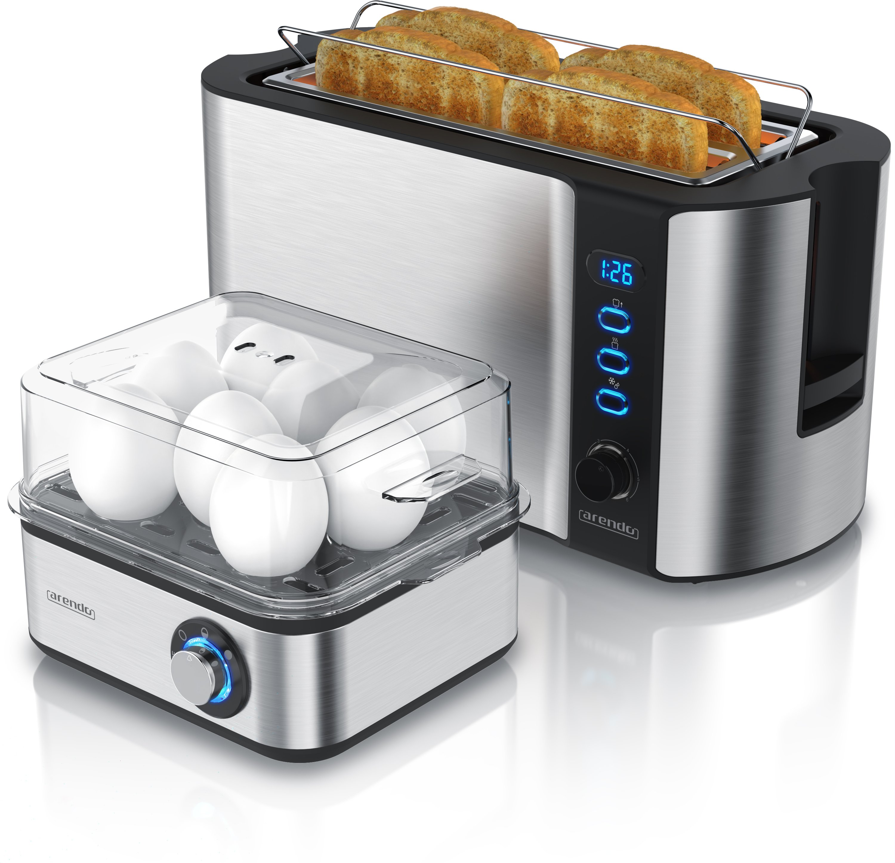 Arendo Set petit déjeuner 2 pièces, Cuiseur d'oeufs 7 pièces & Grille-pain à fente longue pour 4 tranches, argenté