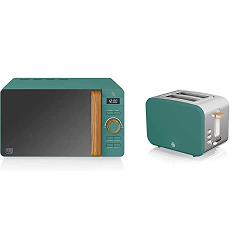 Swan Nordic Micro-ondes numérique 20 L, 6 niveaux de fonctionnement, 800 W de puissance, minuterie 30 min & Nordic Grille-pain à fente large 2 tranches, 3 fonctions, 6 niveaux de grillage, vert mat