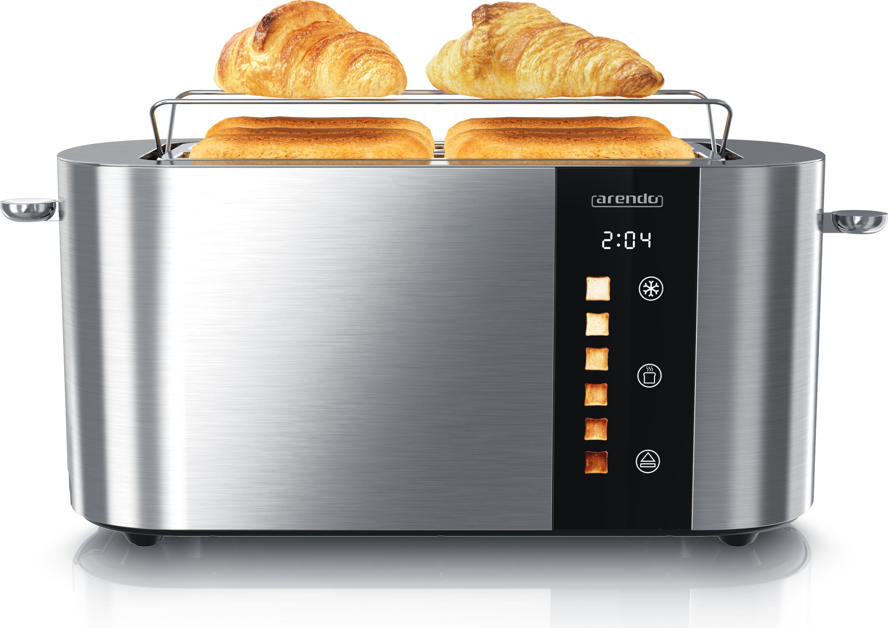 Grille-pain Arendo 4 tranches, fente longue, fente longue, acier inoxydable, 1500W, écran avec indication du temps restant, support à petits pains, fonction dégivrage, boîtier thermo-isolant, écran tactile, argenté