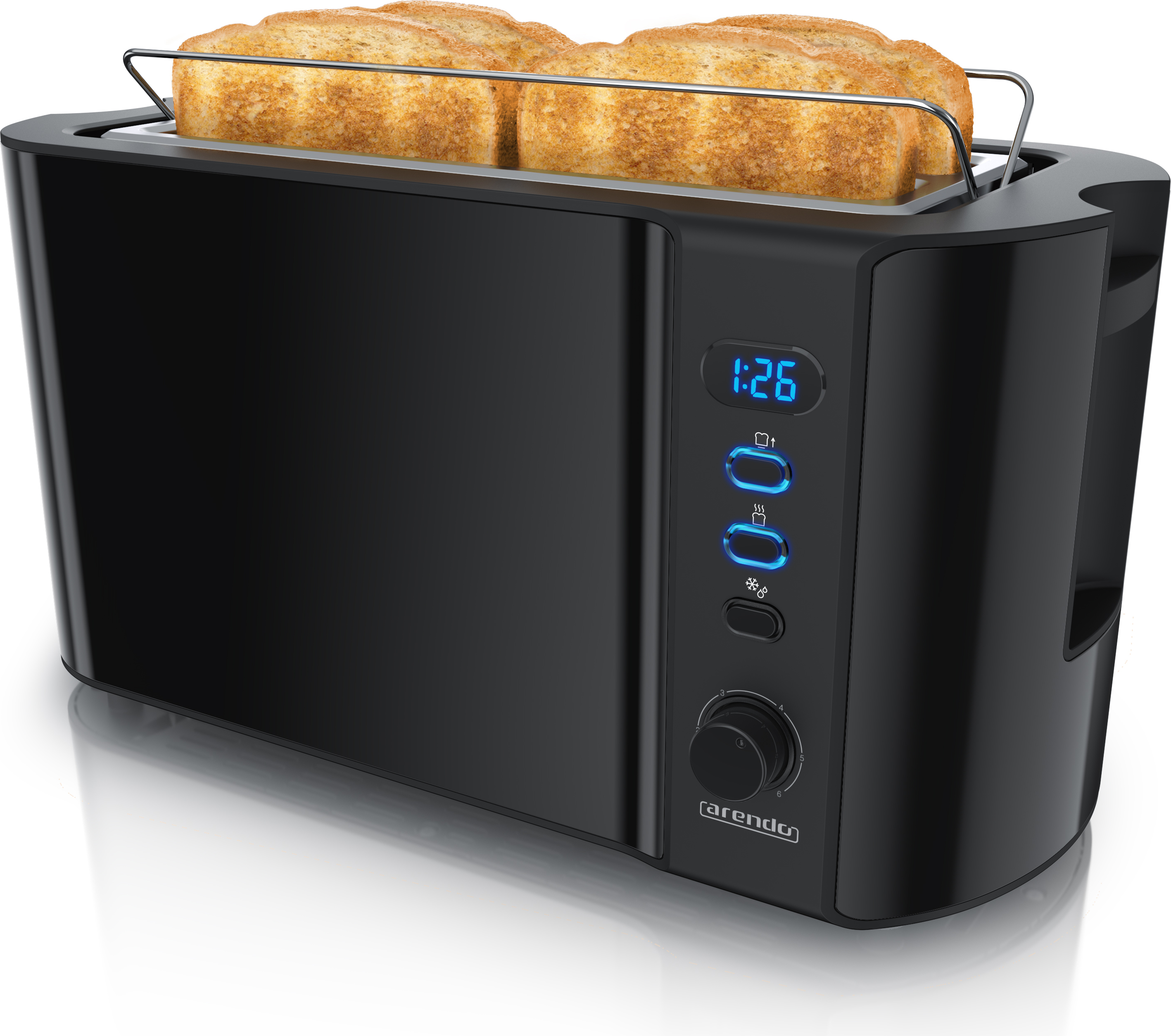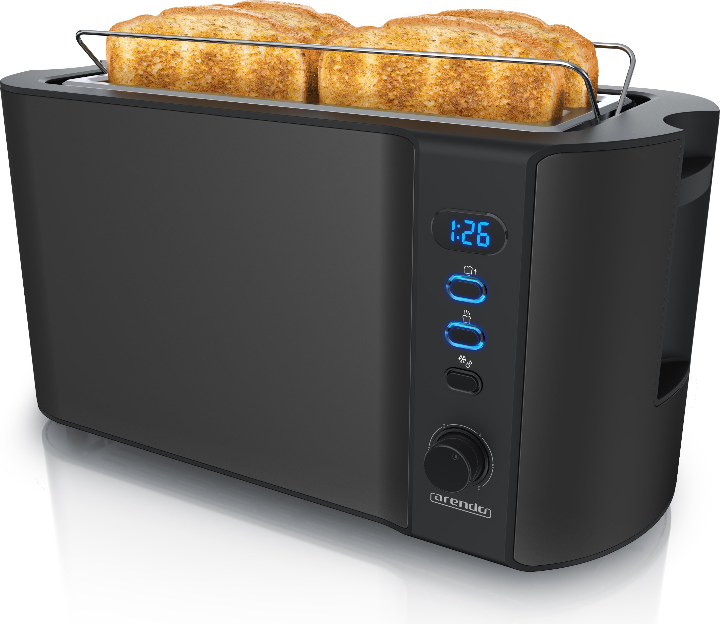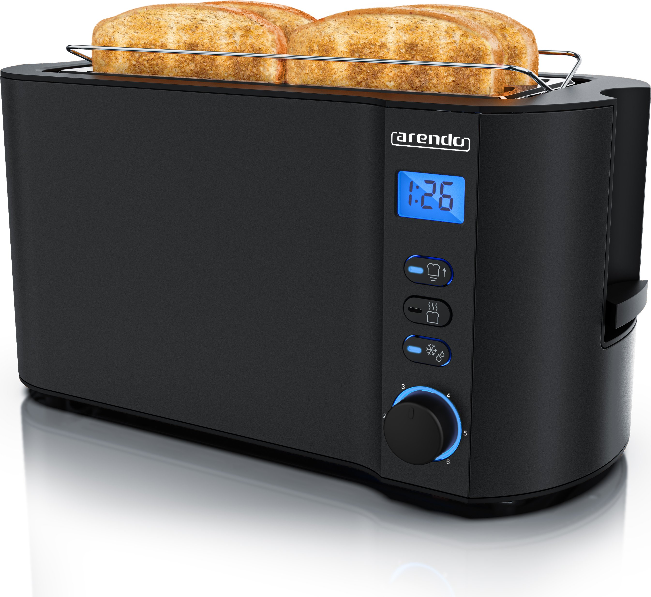 Grille-pain Arendo 4 tranches, fente longue, acier inoxydable, 1500W, écran avec affichage du temps restant, support à petits pains, fonction décongélation, boîtier thermo-isolant, noir-brillant