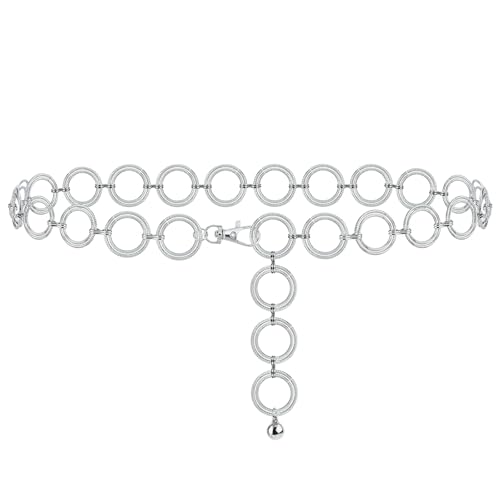 Ceinture à grosse chaîne pour femme, ceinture à chaîne en métal pour femme, chaîne de corps extra longue, réglable, chaîne de ceinture épaisse jusqu'à 51 pouces (anneau avec fil, argent)