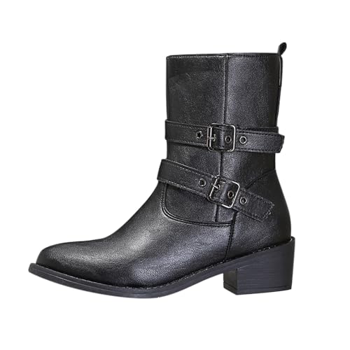 2026 Automne/Hiver Boucle de Ceinture Grosse Fermeture Éclair Latérale Bottes Western Talon Moyen Bout Pointu Femme, Noir , 38 EU