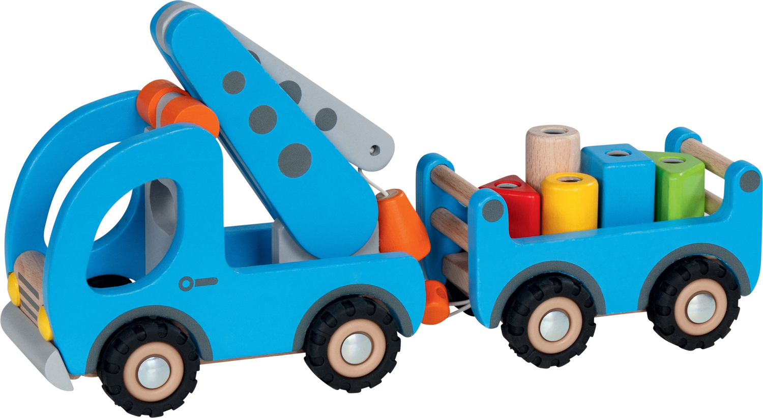 goki 55875 Camion grue avec remorque 32 x 9 x 16 cm, bois, 5 éléments magnétiques, 7 pièces