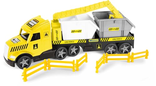 Wader 36471 - Magic Truck remorque surbaissée avec conteneurs de Chantier, Grue, barrières de sécurité et projecteurs Lumineux, Taille env. 79 cm, pour Enfants à partir de 3 Ans, Cadeau