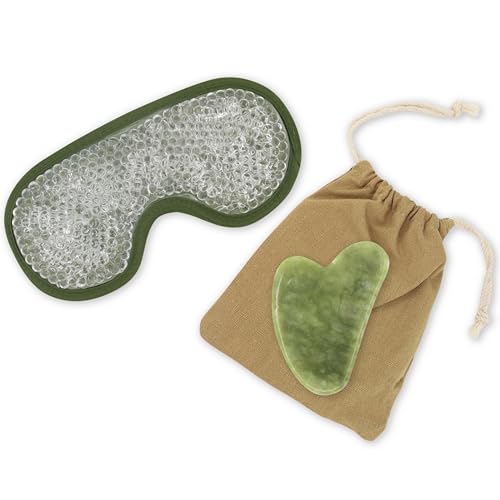 Sun & Sia - Kit Masque Yeux Chaud/Froid et Gua Sha en Pierre Naturelle Jade Vert (+Housse) - Rafraîchit le Teint, Traite les Poches et Cernes, Stimule la Circulation - Effet Anti-Âge et Peau + Ferme