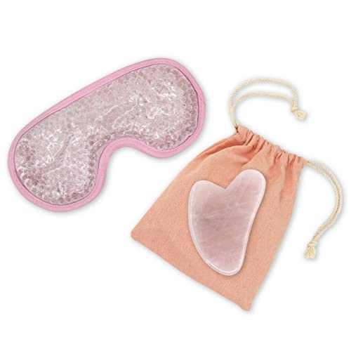 Sun & Sia - Kit Masque Yeux Chaud/Froid et Gua Sha en Pierre Naturelle Quartz Rose (+Housse) - Rafraîchit le Teint, Traite les Poches et Cernes, Stimule la Circulation - Effet Anti-Âge et Peau + Ferme