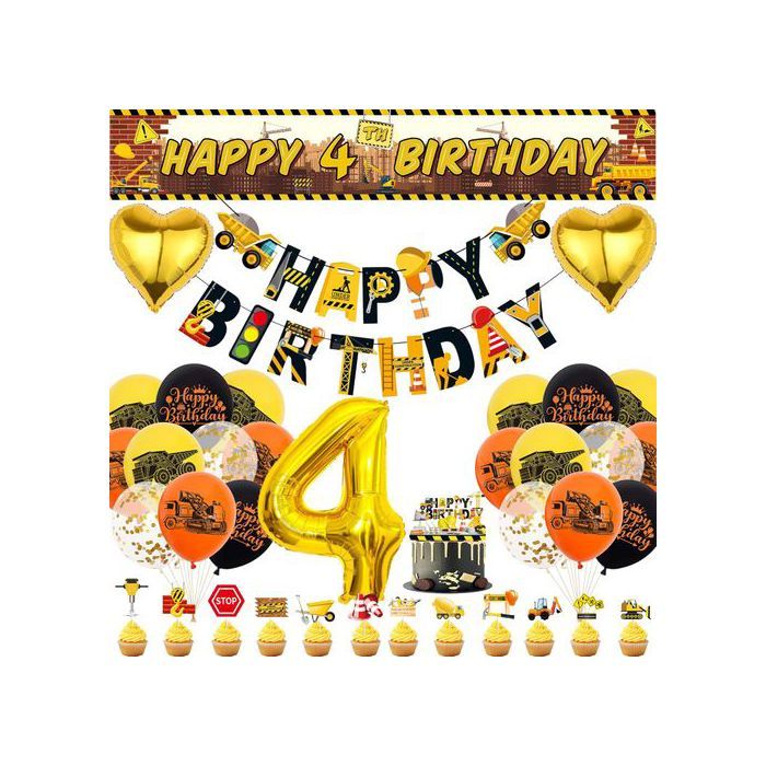 Kit Décoration Anniversaire Chantier 4 Ans - Guirlande Ballon Chiffre 4 Bannière Toppers Gâteau - Thème Construction Enfant