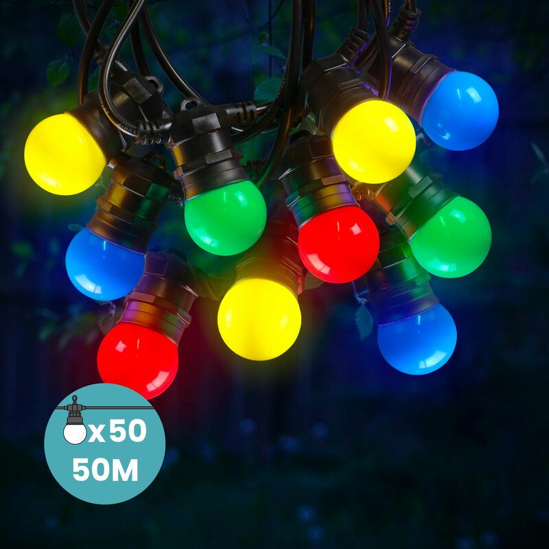 Guirlande lumineuse guinguette 50M 50 ampoules LED multicolores E27 1W câble noir extensible