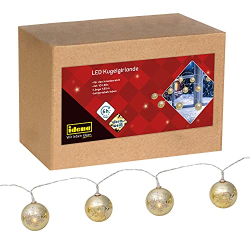 Idena 31267 Guirlande lumineuse à 10 LED avec boules de Noël dorées et fonction minuterie de 6 heures Fonctionnement à piles Env. 1,65 m de long Décoration d'intérieur