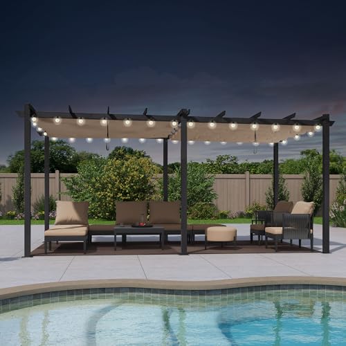 PURPLE LEAF Pergola avec Guirlande Lumineuse Exterieure Pergola Jardin Exterieur 4 x 3,2 m Tissu Teint en Fil, Pergolas Aluminium Toit Rétractable, Kaki