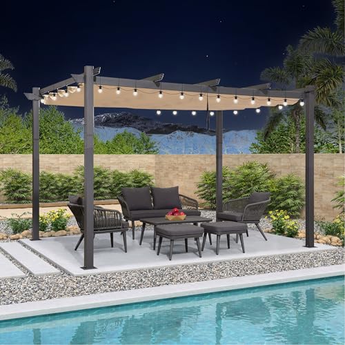 PURPLE LEAF Pergola avec Guirlande Lumineuse Exterieure Pergola Jardin Exterieur 4 x 3 m Tissu Teint en Fil, Pergolas Aluminium Toit Rétractable, Kaki