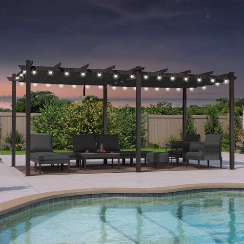 PURPLE LEAF Pergola avec Guirlande Lumineuse Exterieure Pergola Jardin Exterieur 3,65 x 3 m Tissu Teint en Fil, Pergolas Aluminium Toit Rétractable, Gris
