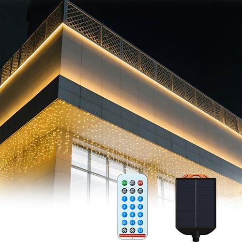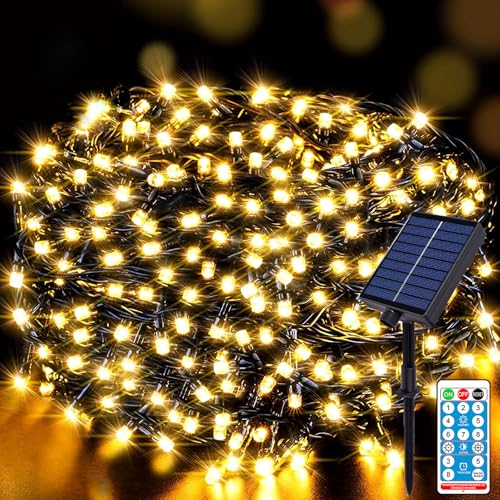 HENGMEI Guirlande lumineuse solaire d'extérieur avec 200 LED - 5 m - Avec télécommande - Blanc chaud - 8 modes d'éclairage - Étanche