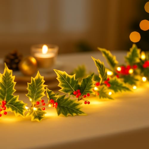 Talking Tables Holly Lights Guirlande lumineuse 2,6 m 10 LED en tissu, rouge, vert, fil argenté, décoration de chambre, Noël, mariage, Saint-Valentin, fête de fiançailles, fête prénuptiale,
