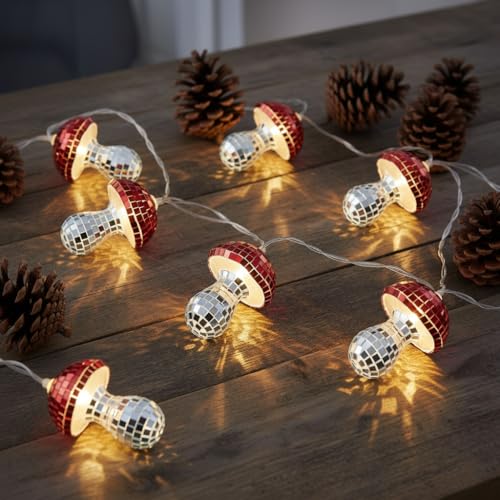 Talking Tables Disco Mushrooms Guirlande lumineuse 1,6 m en tissu 10 LED, rouge, fil argenté, décoration de chambre, Noël, mariage, Saint-Valentin, fête de fiançailles, fête prénuptiale,