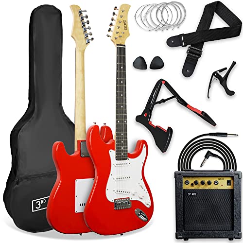 3rd Avenue guitare électrique 4/4 taille standard avec ampli 10 W, jack, stand, housse de transport, sangle, jeu de cordes de rechange, médiators et capodastre – Rouge