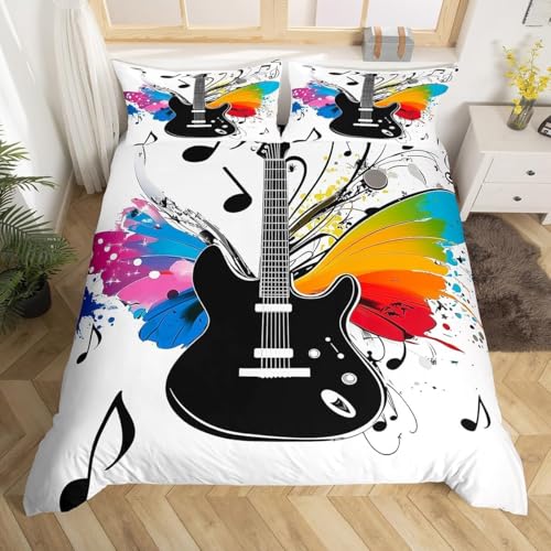 Housse de Couette 140x200 Enfant Guitare 3D Parure de Lit 1 Personne en Microfibre Musique Rock 3 Pièces Ensemble de literie Noir avec Fermeture Éclair et 2 Taies d'oreiller E-651