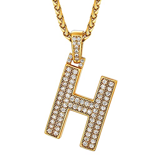 U7 Collier Lettre H Plaqué Or Homme Pendentif Initiale Serte d'Oxyde de Zirconium avec Chaîne 3mm Ajustable 55+5cm