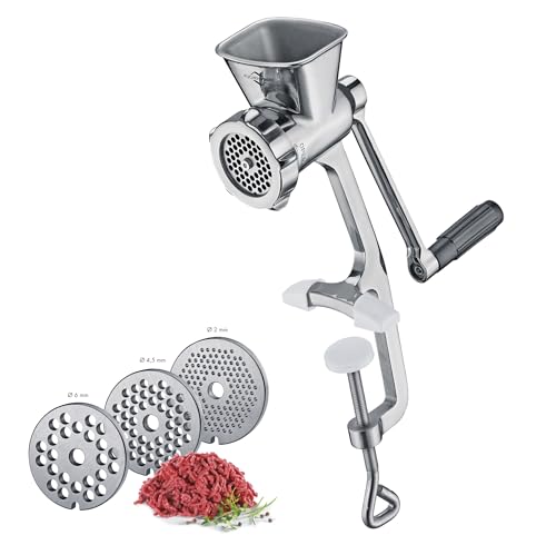 Küchenprofi SOLIDO Hachoir à viande manuel en acier inoxydable 2.0, avec 3 disques perforés, un embout à pâtisserie et 3 embouts de remplissage de saucisses, avec pince de table extra large 12 x 10 x
