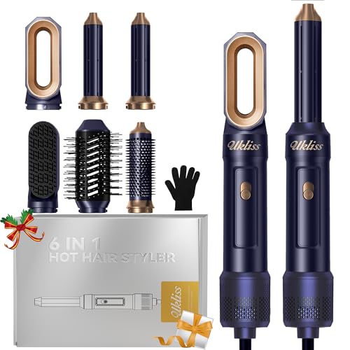 UKLISS Seche Cheveux & Air Styler 6 en 1, Brosse Soufflante Brushing avec Hair Dryer, Auto Boucleur a Air, Brosse Lissante Chauffante, Thermal Brush, Hairstyler Airbrush Cadeaux pour Femmes - Bleu