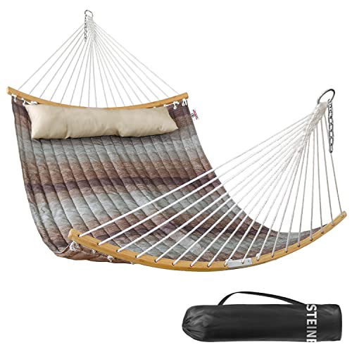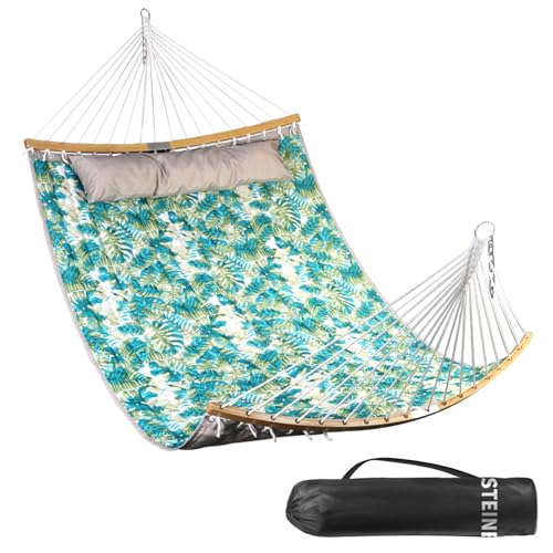 Bathonly Hamac Double, Hamac 2 Personnes en Tissu Matelassé De 335 cm pour l'Extérieur avec Oreiller, Barre d'écartement Incurvée Pliable, Chaînes, Sac de Transport, Capacité 204 Kg, Blueleaves