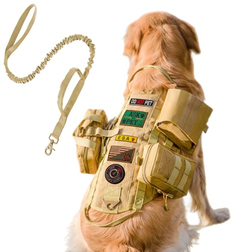 AIWAI Harnais de Chien Tactique avec Pochettes, Gilet pour Chiens de Grande et Moyenne Taille, Harnais Militaire réglable avec poignée pour la Marche, la randonnée, Le Dressage - Kaki, avec Laisse
