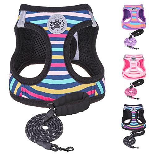BEAUTYZOO Ensemble Harnais et Laisse pour Petits Chiens, Harnais Anti-Traction pour Chiots de Taille XS, S, Chiens et Chats, Maille Respirante, réglable, Respirant, Doux, Anti-Fuite, Rayures Bleu