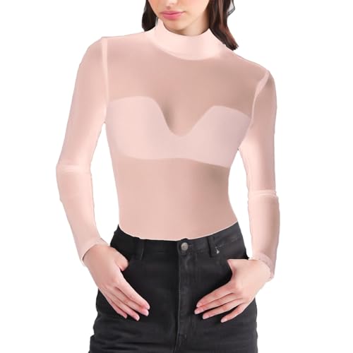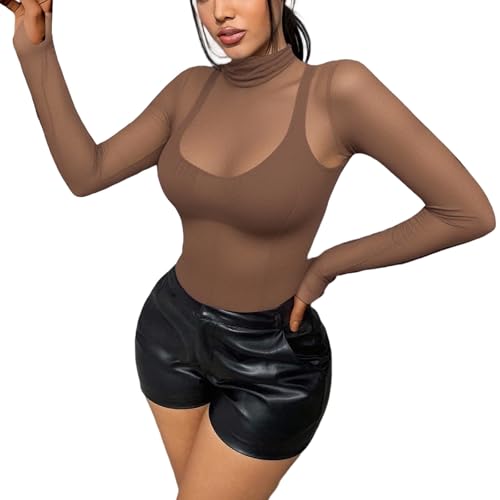 T-shirt à manches longues pour femme - Haut en maille - Haut sexy pour fête - Transparent - Sexy - Blazer marron - T-shirt à manches longues élégant - Chemisier Dirndl - Haut en dentelle - Noir